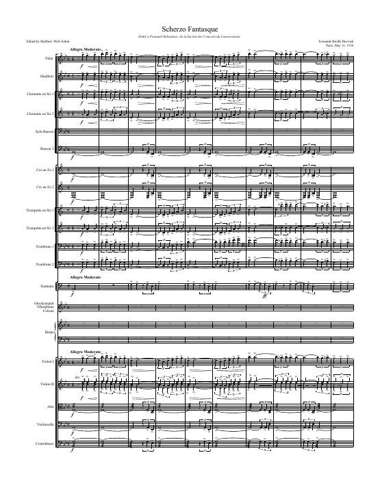 Scherzo Fantasque comes from Decruck’s early period of composition. The music fuses virtuosic passages drawn from the classical scherzo, modal scales and harmonies as well as French cabaret song within its capricious musical sections—all which give the work an improvisatory feel. It was dedicated to French bassoonist Fernand Oubradous and the Société des Concerts du Conservatoire. Melissa Kritzer, Matthew Aubin and The Chelsea Symphony performed the work on June 3, 2017 in New York City. Contact Matthew Aubin for newly engraved parts. Alain Decruck has a set of original parts (likely to have been owned by Oubradous).